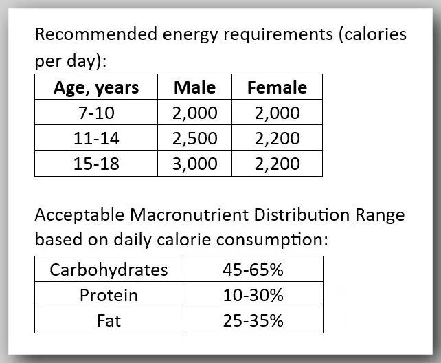 How much do we eat? Specific amounts and calories can be individualized to the athlete, but in the table seen here are general recommendations for adolescents and teens engaging in high-level training and competition.